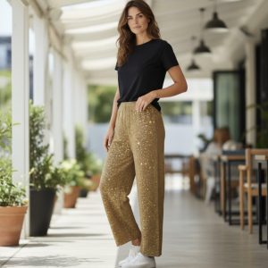 35,00 €31,50 €Gold foil details παντελόνα σε ταμπά απόχρωση με λεπτομέρειες από φύλλα χρυσού στο σχέδιο της.