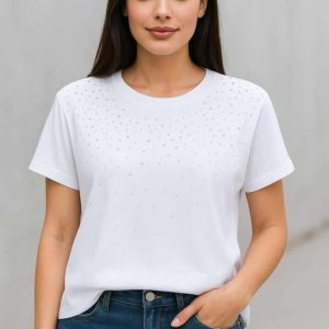 Μπλούζα κοντομάνικη σε λευκό με στρας.