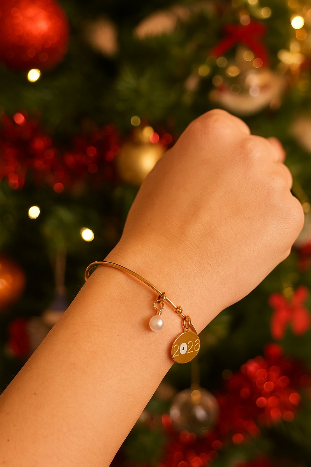 Ατσάλινη χειροπέδα γούρι για το νέο έτος σε χρυσή απόχρωση με κρεμαστή περλίτσα.