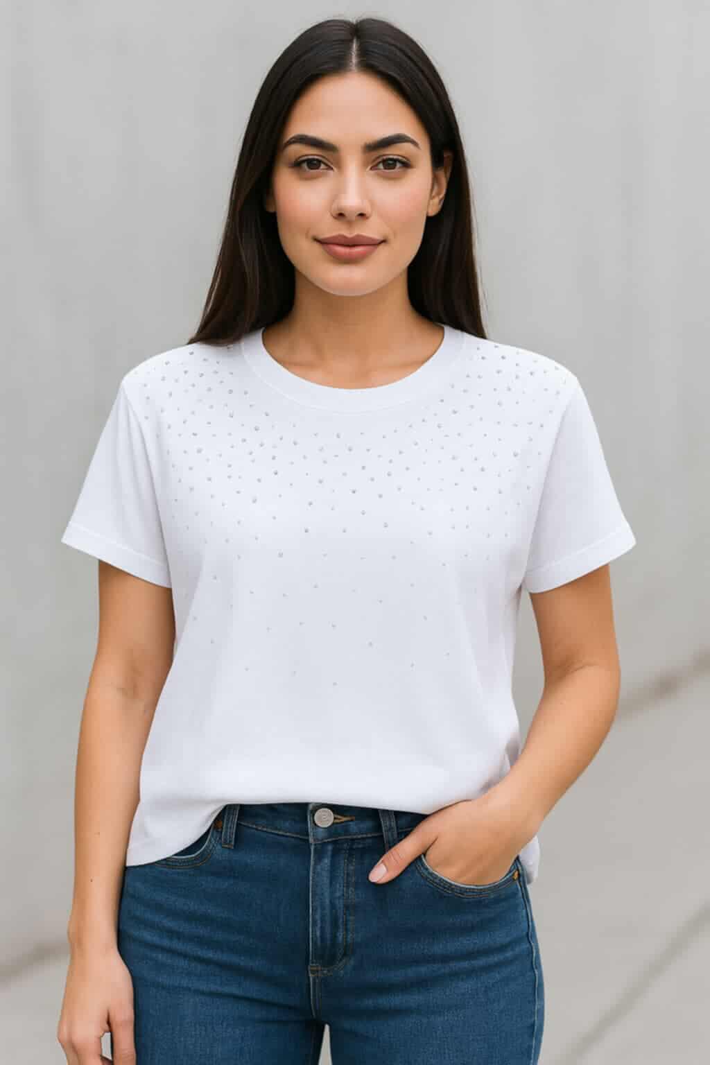 Μπλούζα κοντομάνικη σε λευκό με στρας.