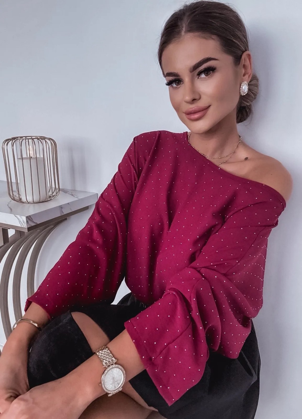 Μπλούζα σε μπορντό απόχρωση με μανίκι τύπου νυχτερίδα με στρας. Ελαστική και άνετη να την συνδιάσεις με τα πάντα.
