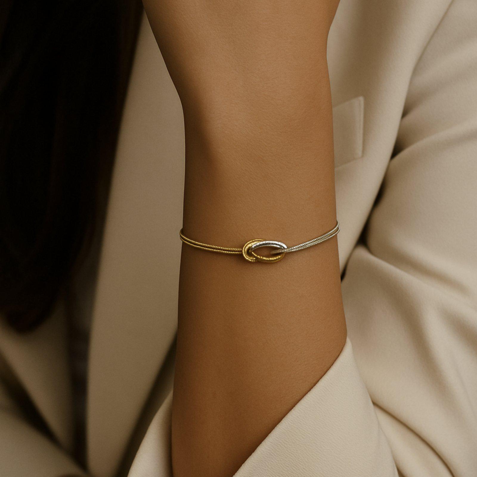 Ευκολοφόρετο, Minimal, βραχιόλι σε χρυσή και ασημί απόχρωση με ένα κομψό δέσιμο στο κέντρο.