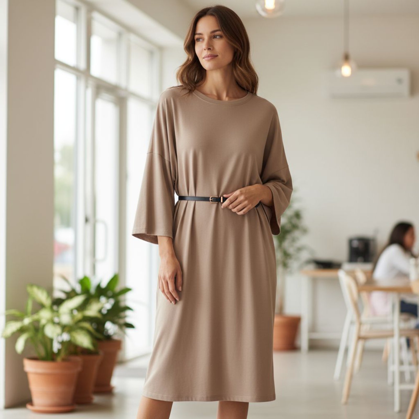 Φόρεμα σε μπεζ απόχρωση με μανίκι καμπάνα και ζωνάκι στην μέση.