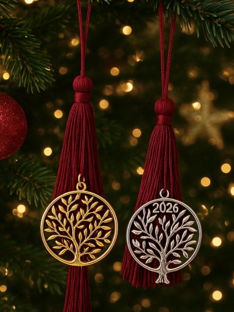 Γούρι με φούντα και μεταλλικό ρόδι σε 2 αποχρώσεις. Ιδανικό στολίδι τύχης για το σπίτι ή το γραφείο.