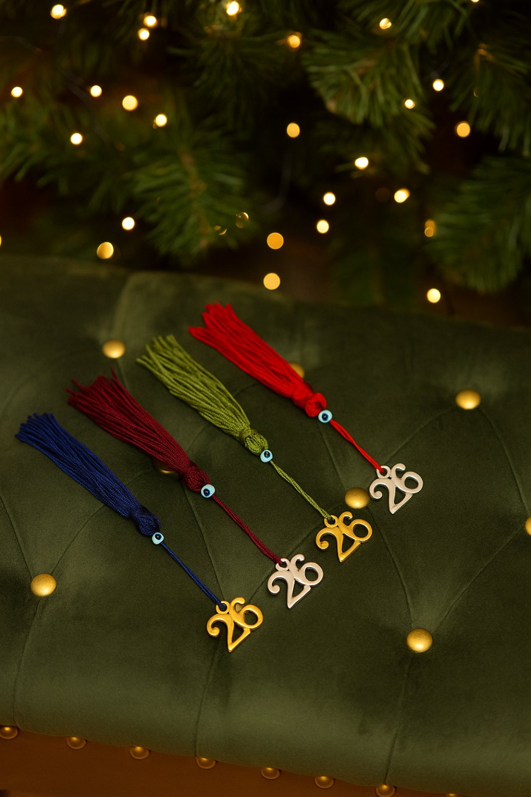Χειροποίητο γούρι με φούντα σε 4 αποχρώσεις, με ματάκι και μεταλλικό 26 σε χρυσή και ασημί απόχρωση.