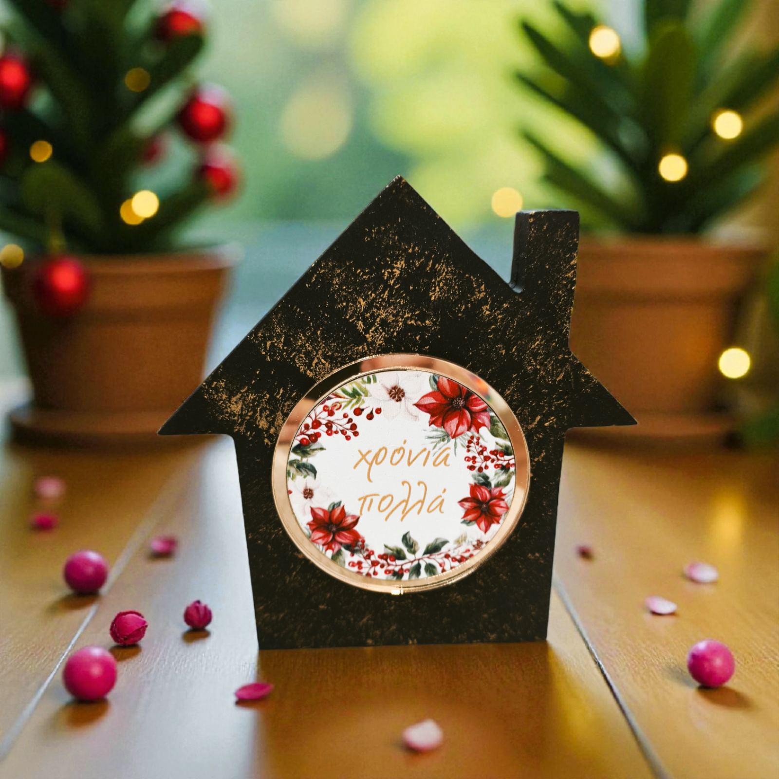 Επιτραπέζιο γούρι σε σχήμα σπιτιού. Διακοσμεί τον χώρο με γιορτινή ζεστασιά και μεταφέρει ευχές για χαρά και τύχη. Προσθέτει κομψή, γιορτινή πινελιά σε κάθε διακόσμηση. Ιδανικό για δώρο σε σπίτι ή γραφείο.