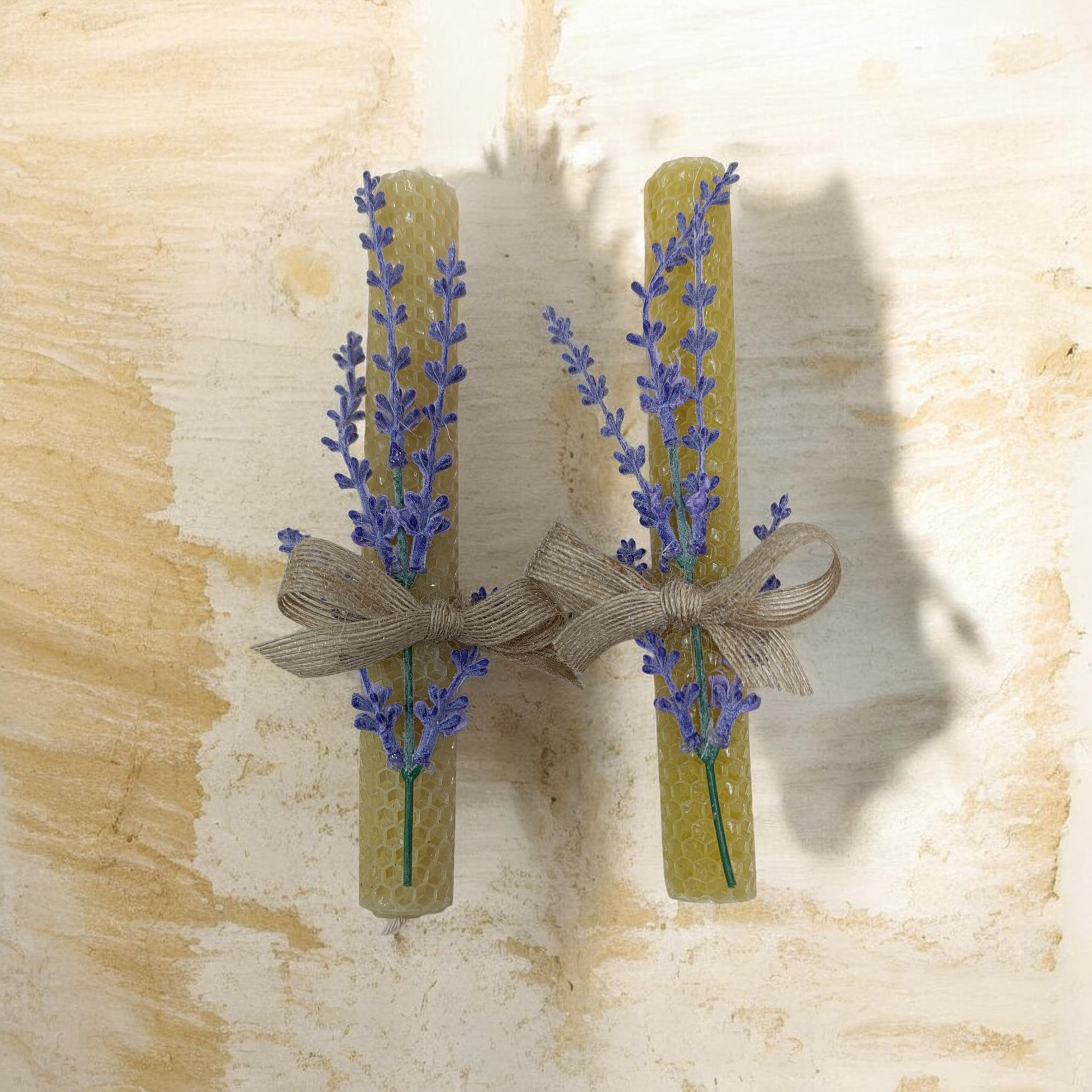 Χειροποίητα λαμπάδα κερήθρας με αποξηραμένα άνθη λεβάντας.