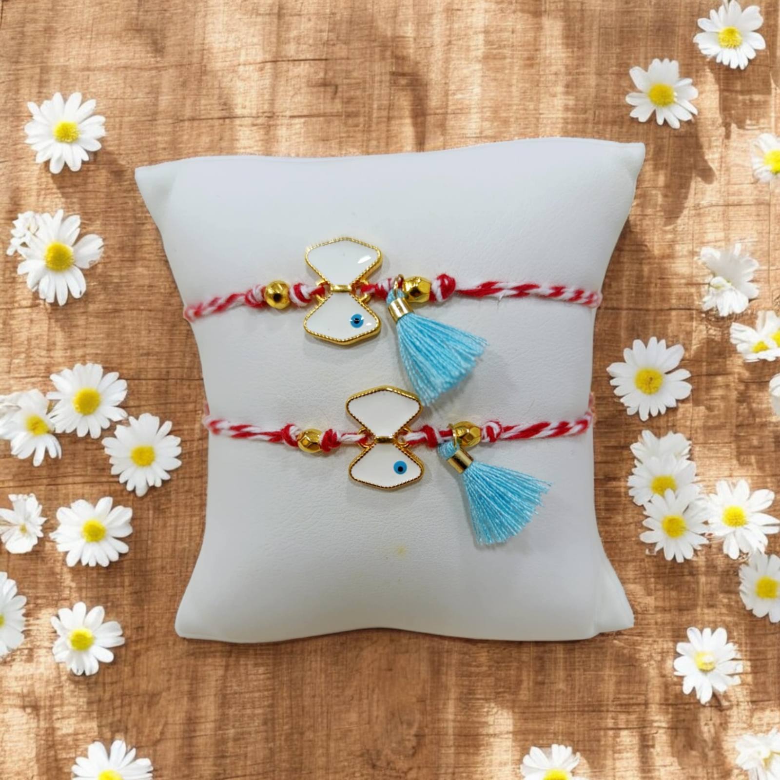 Χειροποίητο μαρτάκι με με μεταλλική πεταλούδα με λευκό σμάλτο και γαλάζιο φουντάκι. Κλείσιμο μακραμέ. Με αυξομείωση για όλους τους καρπούς.