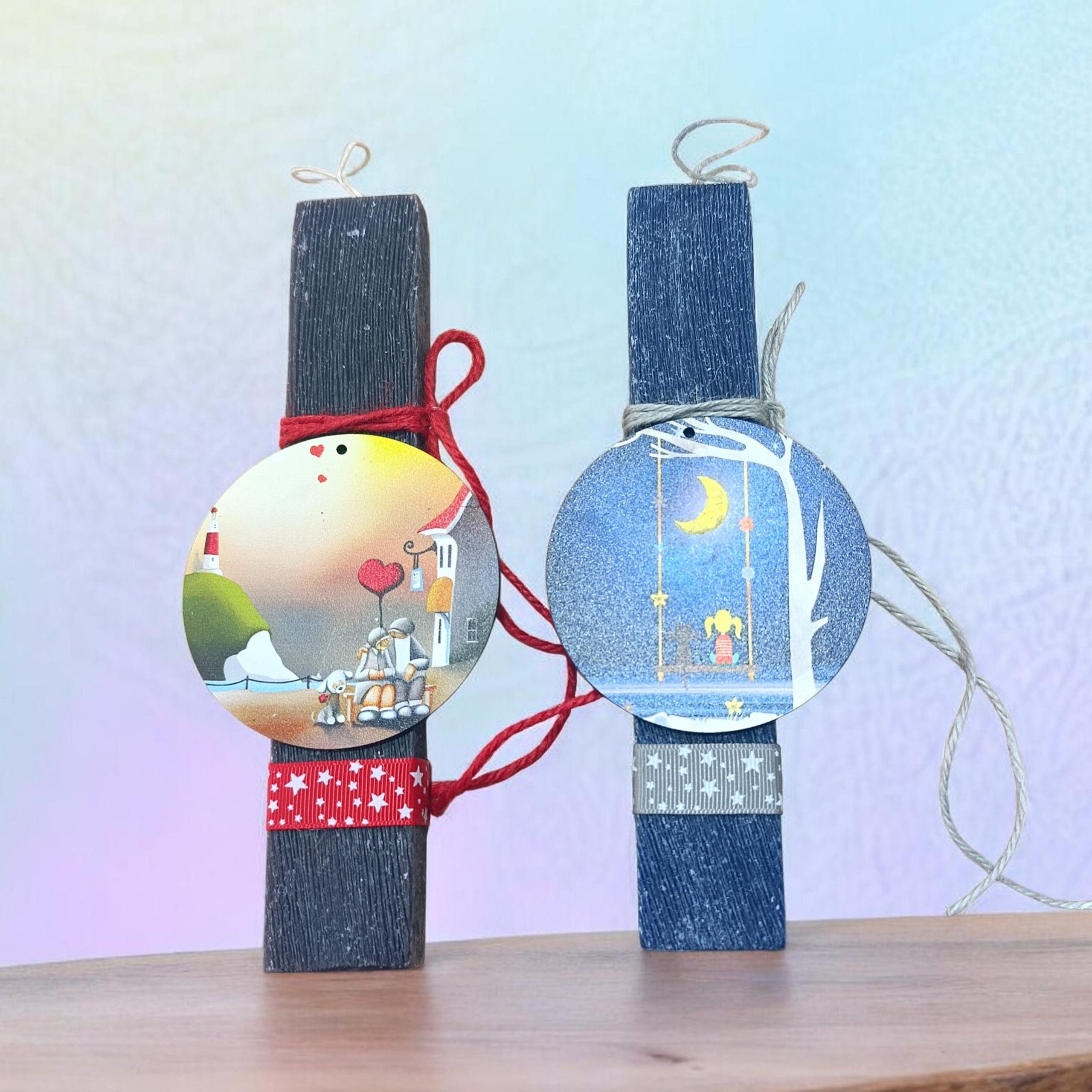Χειροποίητες αρωματικές παραμυθένιες λαμπάδες, με ξύλινο στοιχείο με παραστάσεις ζευγάρι ή κορίστι.