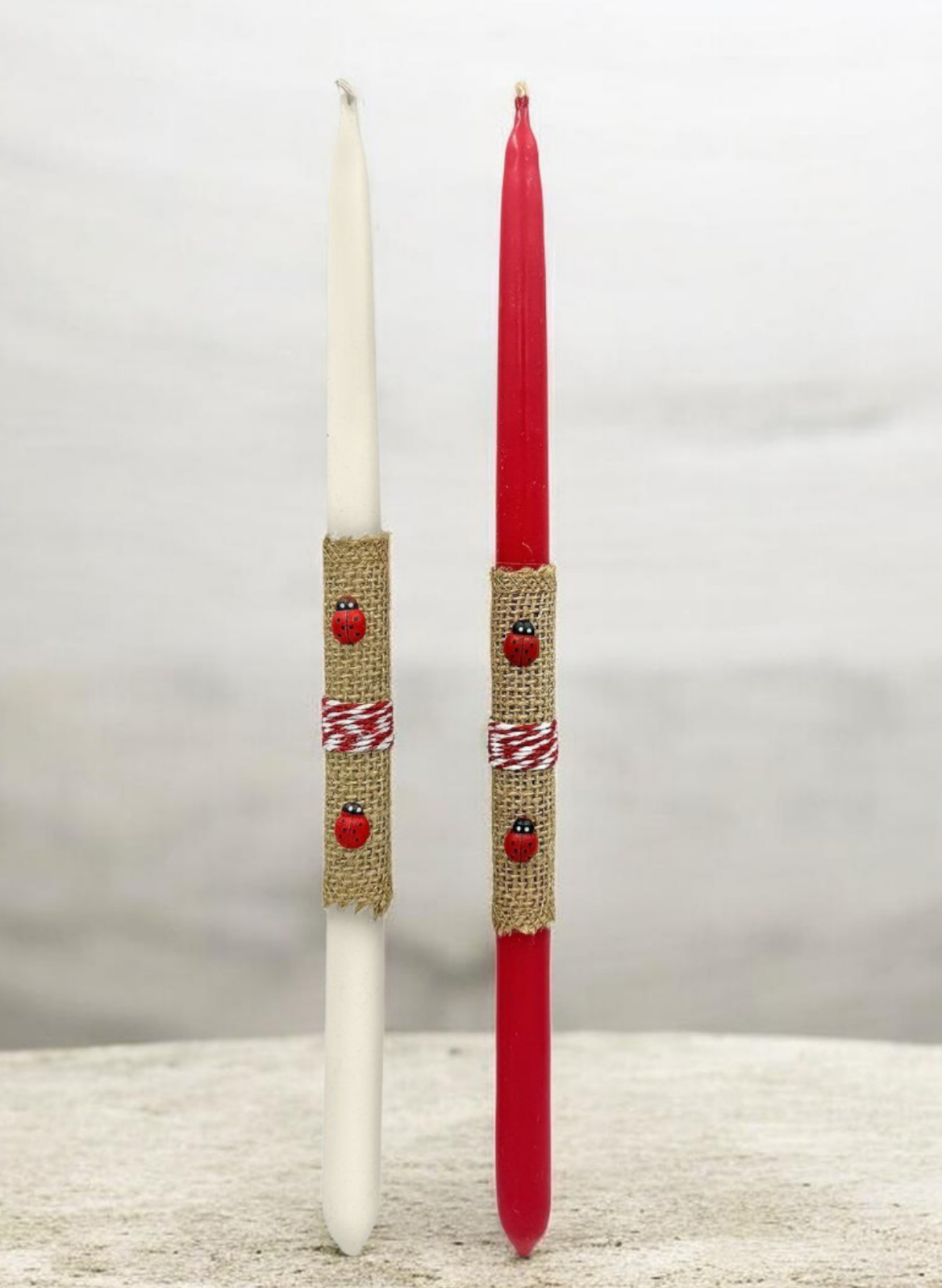 Λαμπάδα με λινάτσα και πασχαλίτσες. Σε 2 αποχρώσεις.