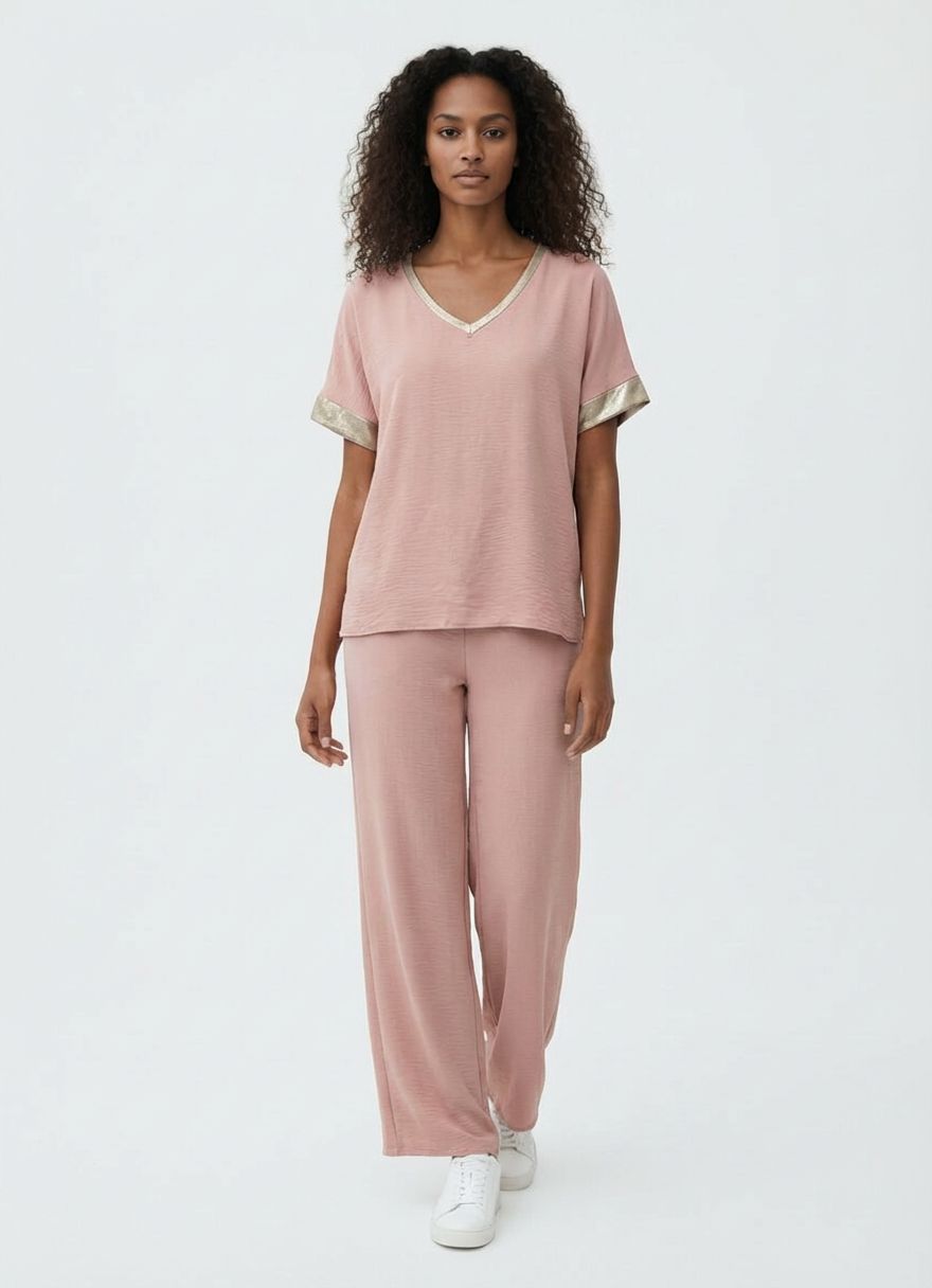 Άνετο σετ καθημερινό σε ροζ απόχρωση με χρυσή λεπτομέρεια στο μανίκι.