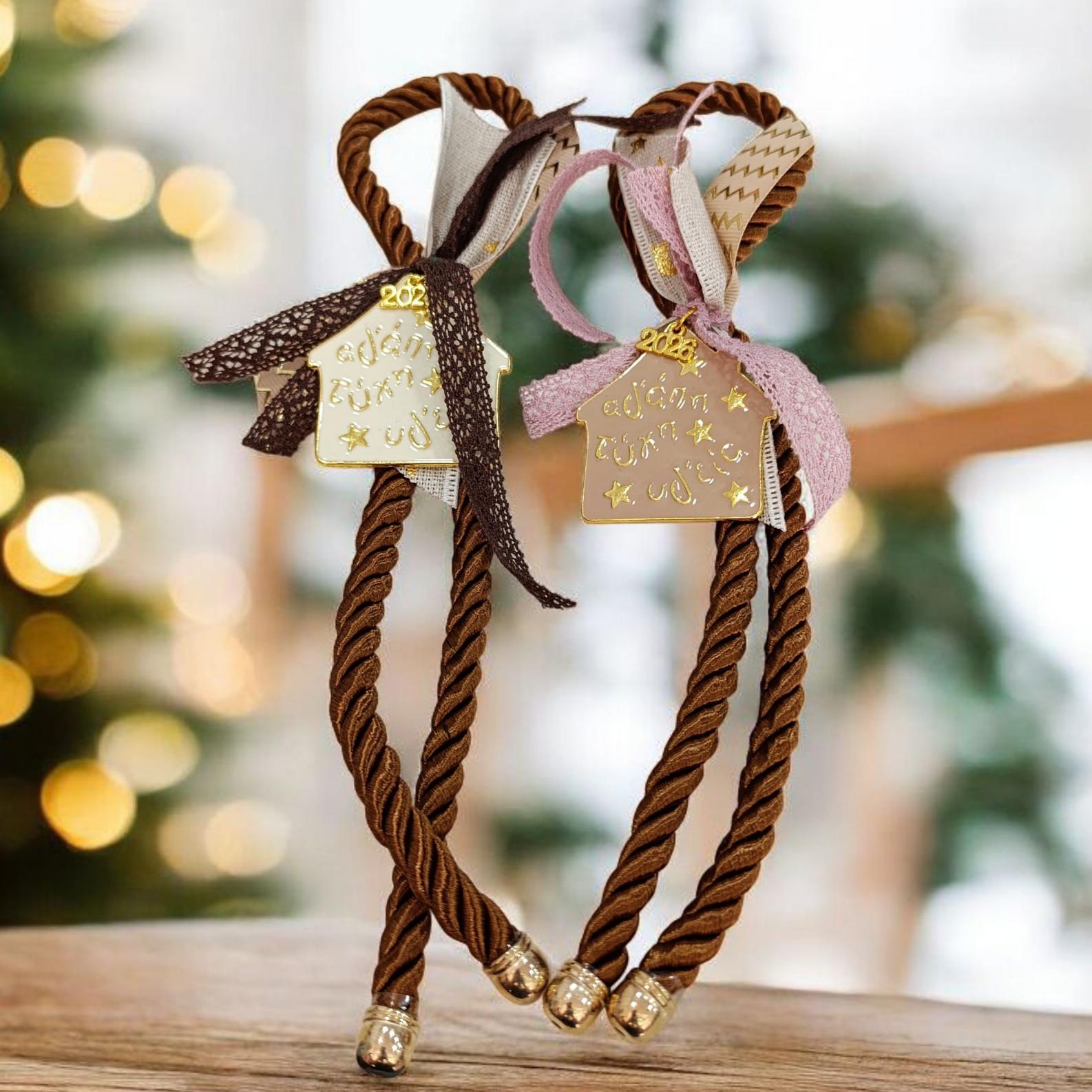 Κρεμαστό γούρι με μεταλλικό σχέδιο σπίτι (χρωματιστό με σμάλτο). Δεμένο σε καφέ γυαλιστερό κορδόνι.