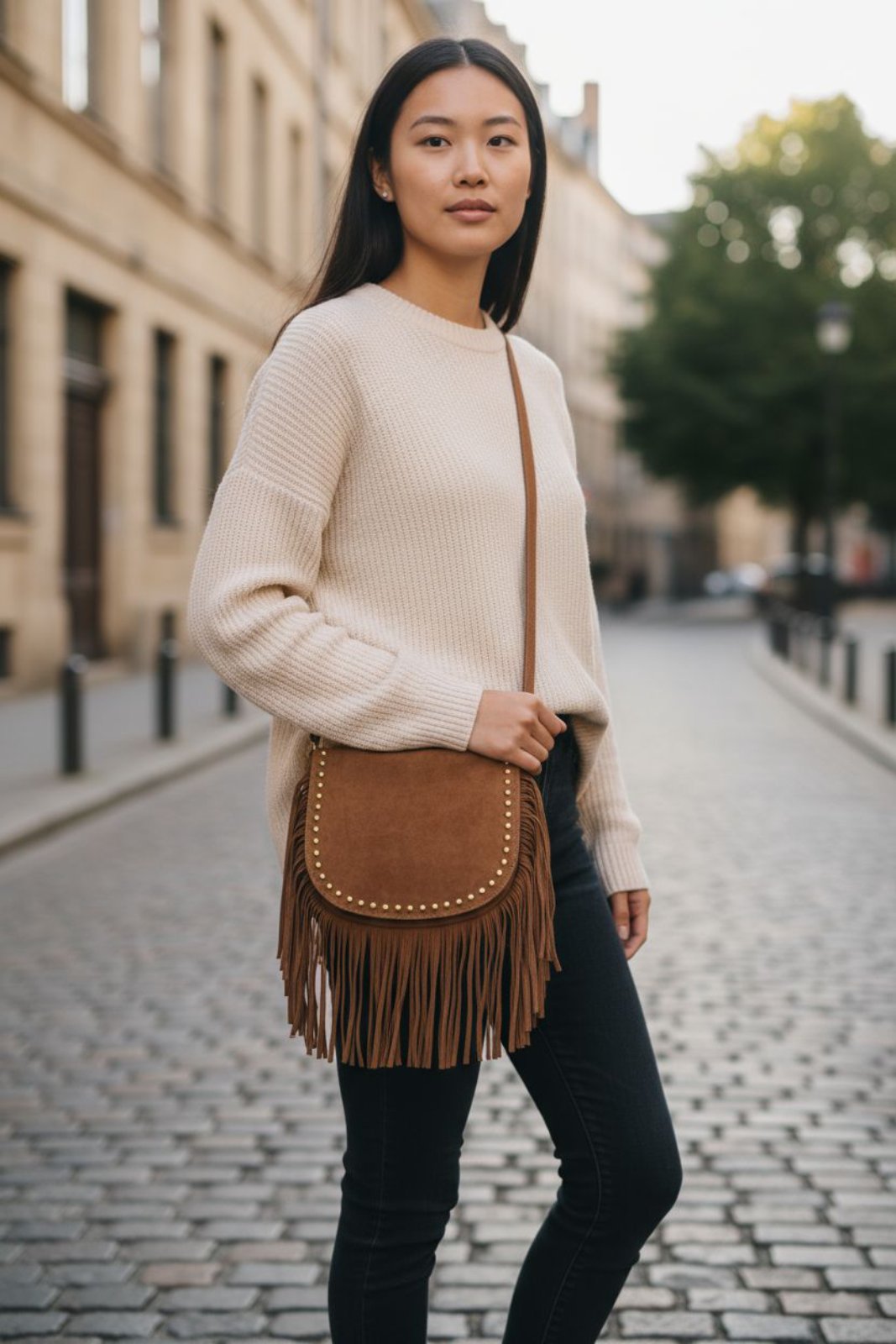Η τσάντα ξεχωρίζει χάρη στα εντυπωσιακά κρόσσια και τα τρουκς που προσθέτουν κίνηση και boho διάθεση.
