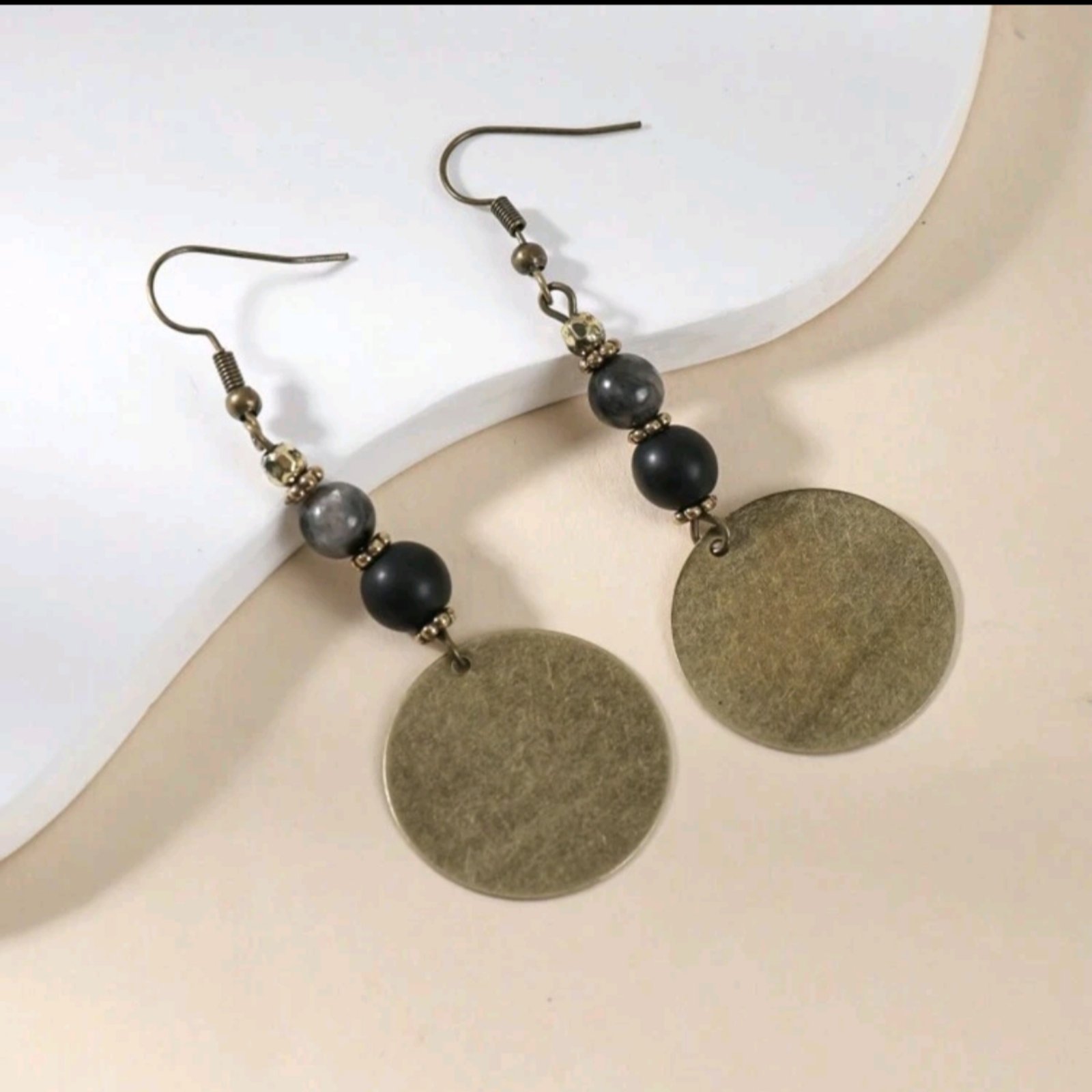 Vintage σκουλαρίκια σε μπρούτζινη απόχρωση με μαύρες και γκρι χάντρες και στρογγυλο στοιχείο