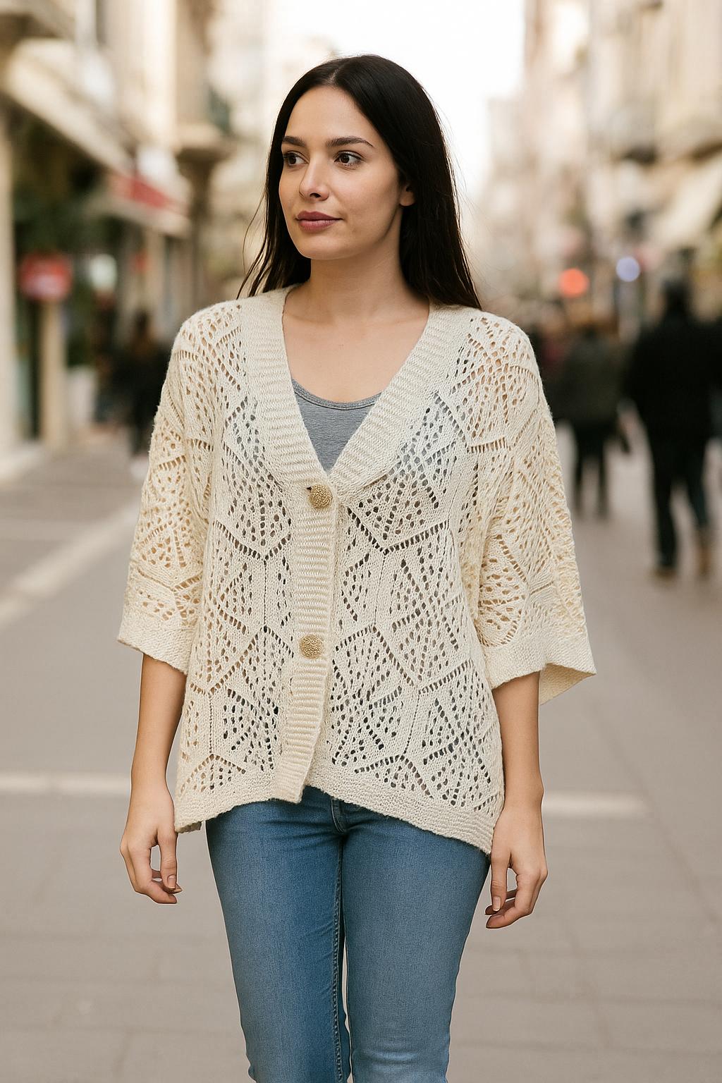 Ζακέτα πλεκτή σε κρεμ απόχρωση, ελαστική με μεγάλα κουμπιά και 3/4 μανίκι.